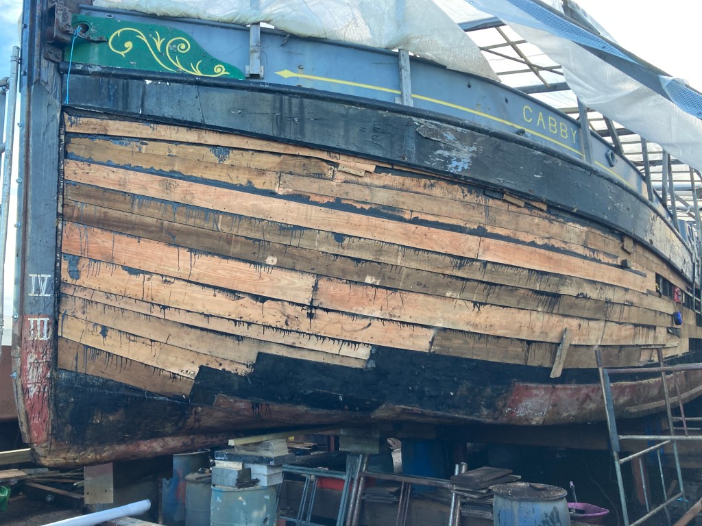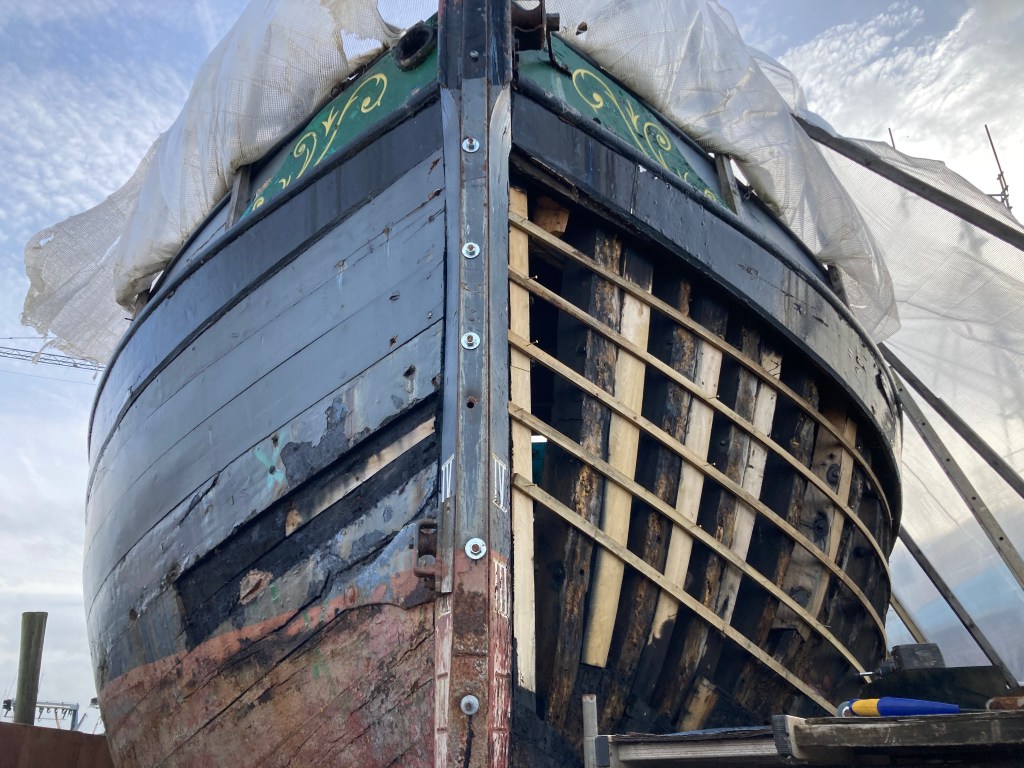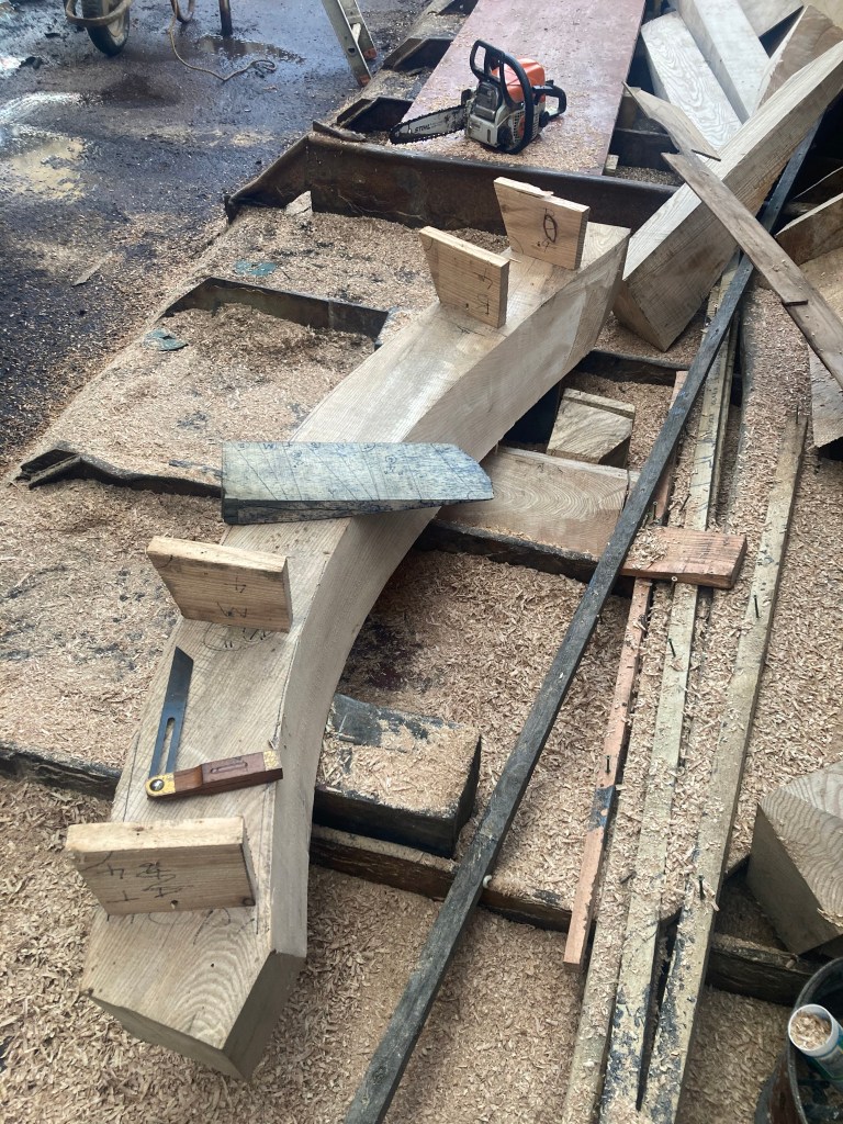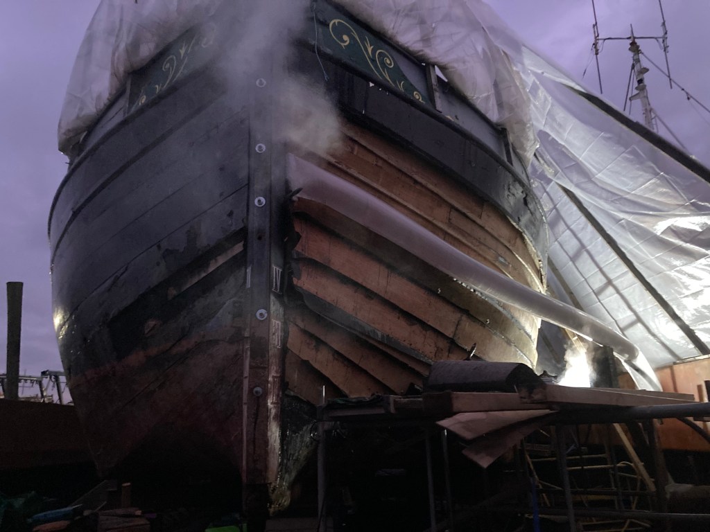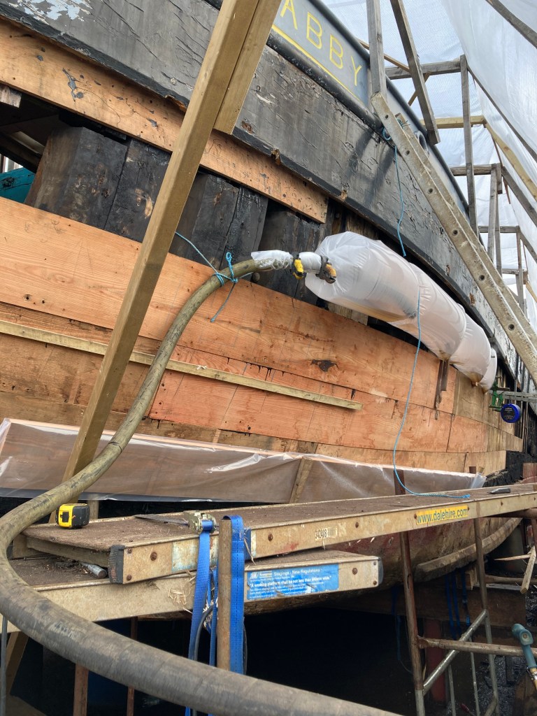 Jim has decided to convert his 32′ gaff rigged ocean cruiser to Junk rig. He’s been considering this for quite a long time, and here is the first step in accomplishing that rather dramatic refit. A new fifty foot mast, built around a ten staved douglas core and now sheathed in a vast quantity of carbon fibre, which took several weeks of effort. Being Junk rigged, it’s designed to be unstayed so is really rather huge at the butt end. So I was pleased to simply come up with a way to easily roll the mast during lay-up. Surprisingly, carbon fibre turns out to be quite easy to work with once you get the hang of it, at least the backyard way we were doing it. I’m also interested in some of the physical and dynamic challenges of such a project. Of course extending the vessels keelson, partners, and mast step, building a yard and making the first sail are all still to come, and I hope to be involved with some of these too.